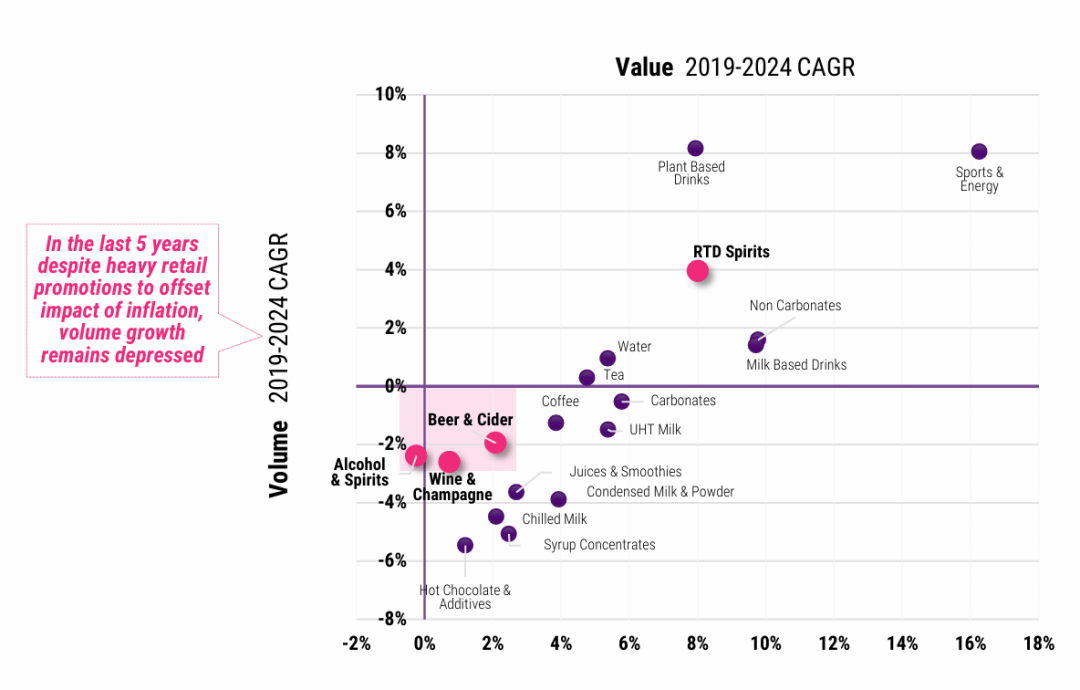 若是立异不克不及供给超越价钱的现实价值,正在过去5年中CAGR增加显著,但现实售卖的液体体积(销量)鄙人降 。即发卖额因通缩维持,但因为平均单价节制适当(以至正在某些促销下显得更划算)。